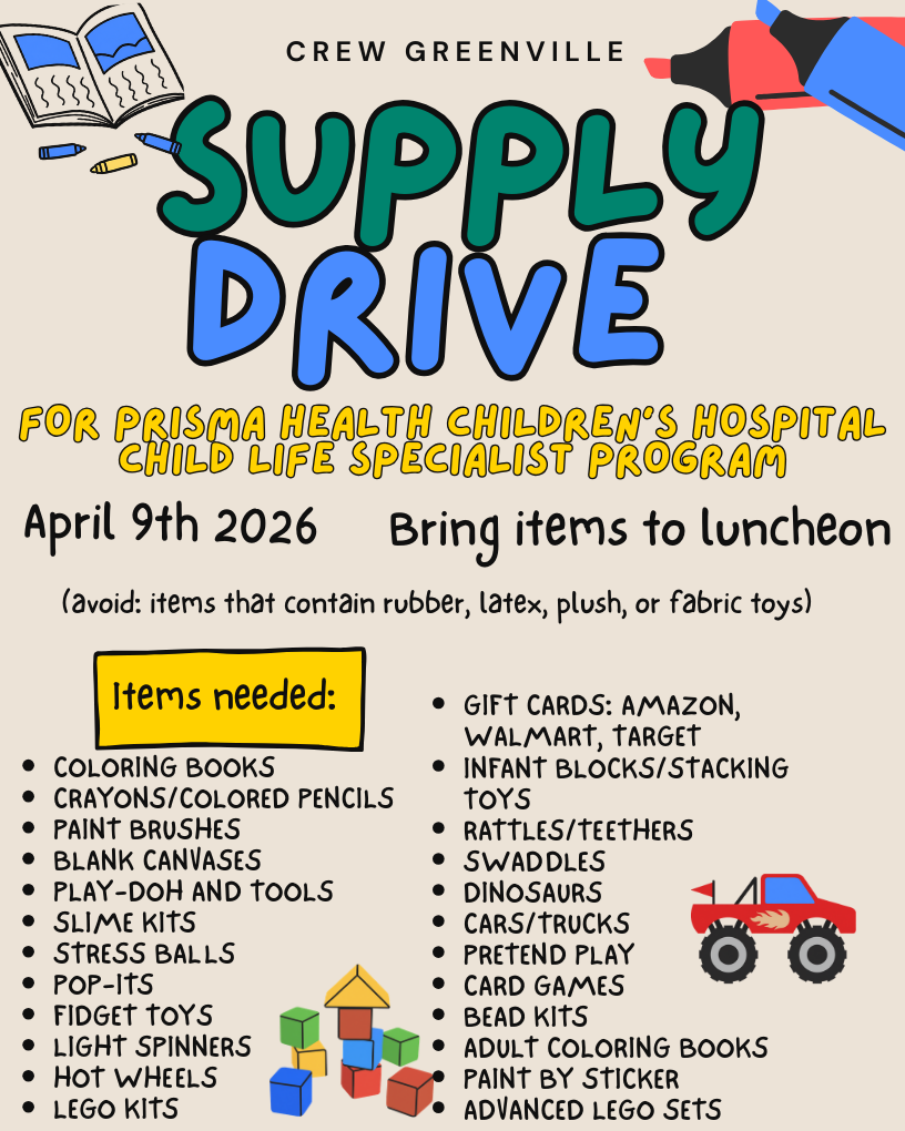 We will also collect supplies for Prisma Health Children's Hospital-Child Life and Special Programs. Child Life Specialists are child development experts who support the emotional and developmental needs of children and families in a health care setting. Through therapeutic play, preparation, and education, they help reduce fear and anxiety while creating comfort and security during the hospital experience. Donations like small toys, sensory items, stuffed animals, and art supplies help bring joy and reassurance to children when they need it most.